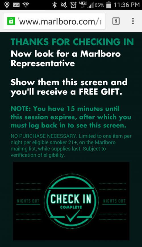 Gift received from the Marlboro Bar Team in March 2015. Receiver was at a bar that typically receives a younger college crowd (mid 20s) in NJ. After checking in via mobile phone user received what looks like a an oversized matchbook. Inside were two coupons for "buy one get one free," as well as a $5 MasterCard gift card.