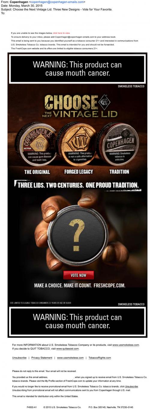 Email from Copehagen inviting the recipient to the brand website to vote on the next vintage lid Cope will use for their snuff cans. Text: "Three lids. Two centuries. One proud tradition."