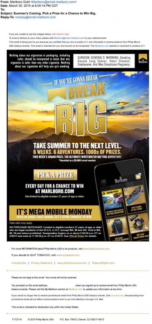 Marlboro Gold email inviting the recipient to "take summer to the next level" and visit the brand website to participate in the Break Big sweepstakes. Visitors will have the chance to win various prizes over 6 weeks. On Mondays, users can make their daily entry via mobile and get 3 extra chances to win in the Mega Mobile Monday promotion.
