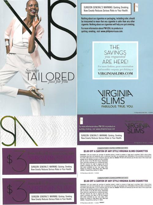 Direct mail from Virginia Slims delivering coupons requested on the brand website. Has an image of a fashionably-dressed woman. Invites the recipient to the brand website for "more fashion, great conversation and monthly coupons." Text: "Savings tailored just for you."