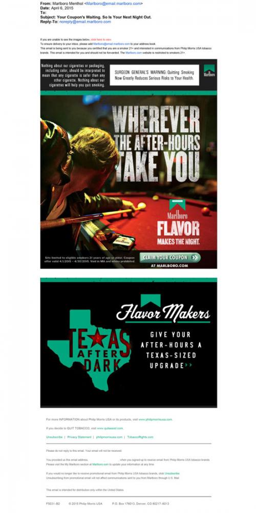 Emailed received from Marlboro Menthol April 2015 reminding recipient to claim their monthly coupon. Email also invites recipient back to the brand website to explore more content of the Flavor Makers and how they celebrate a night out. Text: "Wherever the after-hours take you."