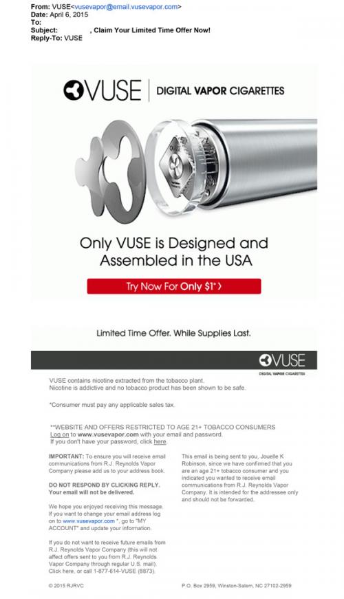 Email received from Vuse April 2015 informing recipient of a special limited time offer. By clicking a link in the email the recipient will be directed to the brand website to claim their special trial offer for Vuse e-cigarettes for only $1. Text: "Only Vuse is Deisgned and Assembled in the USA."