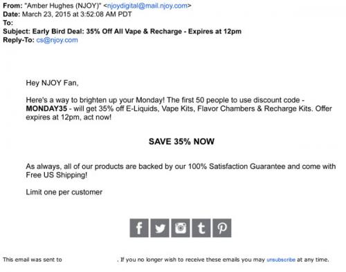 Email discount from NJOY with "a way to brighten up your Monday" for the first 50 customers. The specific products on sale include e-liquids, vape kits, flavor chambers and recharge kits.