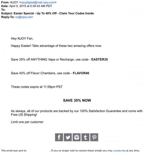 NJOY wishes their email subscribers a Happy Easter with some discount codes.