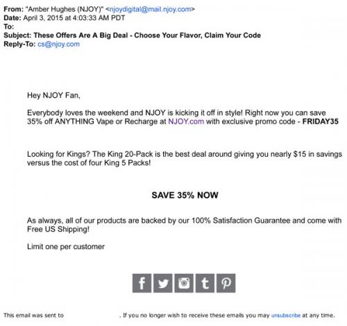 "Everybody loves the weekend and NJOY is kicking it off in style!" Email with a discount code and a promotion of their King 20-pack product as a cost-saving alternative of buying multiple smaller packs.