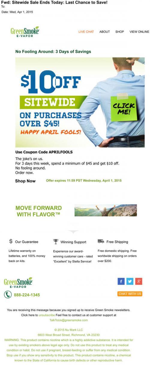 2015 April Fool's discount sale from GreenSmoke. The customer is invited to the brand website to get 10$ off a 45$ purchase.