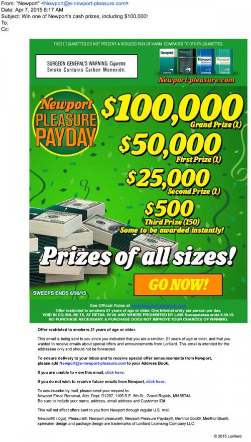 April 2015 email promoting the Newport Pleasure Payday sweepstakes. Includes a link to the brand website to enter the contest.