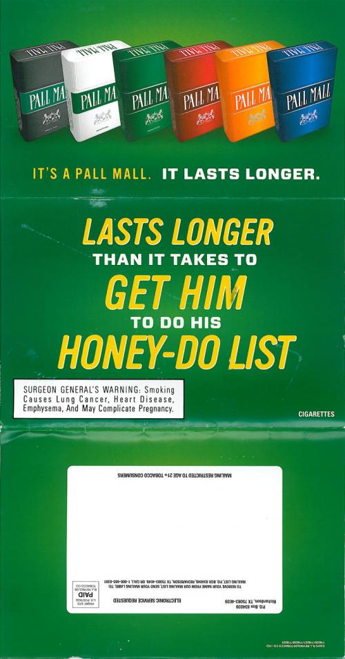 Direct mail received in Texas and South Carolina February 2015 that delivers coupons. Shows their product packaging and promotes the long-lasting quality of their products. Text: "Lasts longer than it takes to get him to do his honey-do list."