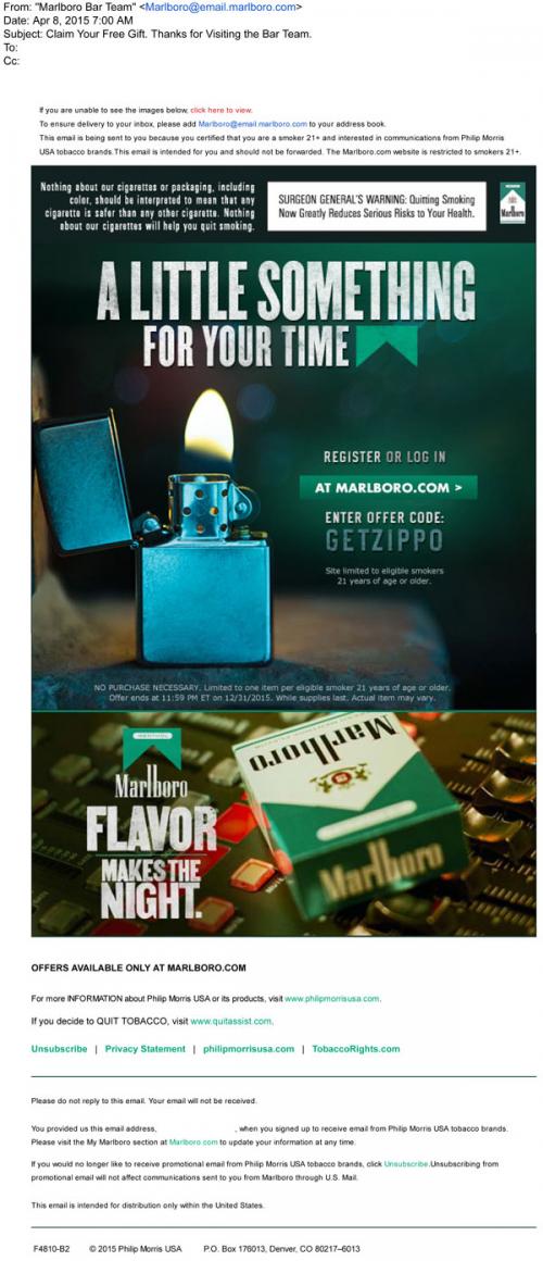As thanks for visiting the Bar Team, Marlboro sends an offer via email for a free Zippo lighter in April 2015. The offer can be claimed on the brand website with the code provided.