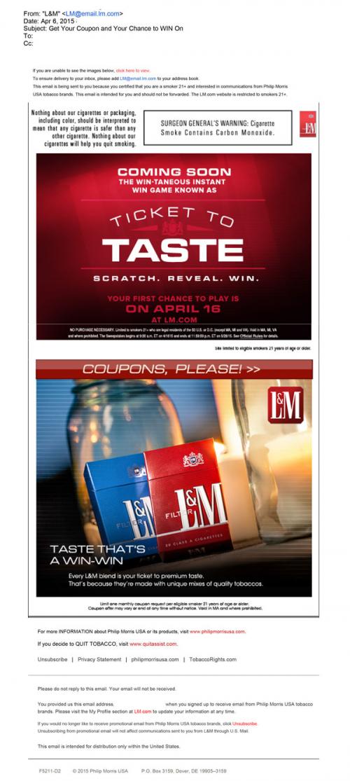 Email received by L&M April 2015 announcing the arrival of new sweepstakes, the Ticket to Taste coming soon towards the end of the month. The email also reminds recipient to claim coupons for the month, with a link to the brand's website.