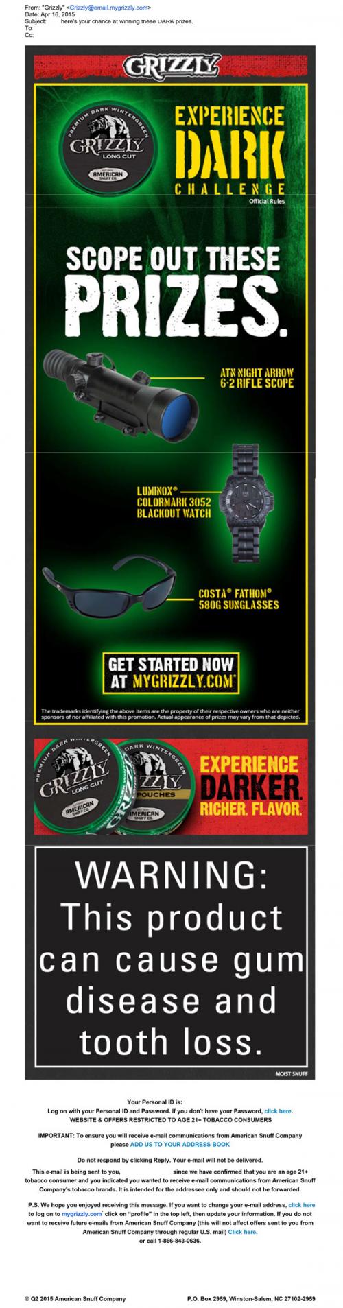 Email from Grizzly received on April 16, 2015 reminding recipient to enter the Grizzly Experience Dark Challenge. Email features images of possible prizes and invites user to brand website to enter. Text: "Scoop out these prizes. Get started now at mygrizzly.com"