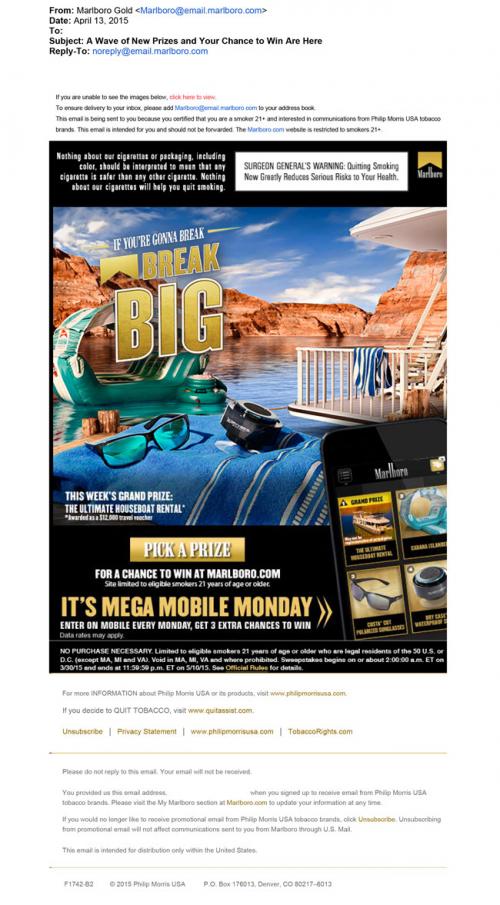 Email received from Marlboro in April 2015 reminding recipient to enter in the Break Big Sweepstakes. The email also reminds user that it is Mega Mobile Monday, and if they enter the sweepstakes using their mobile phone the get 3 extra chances to win.