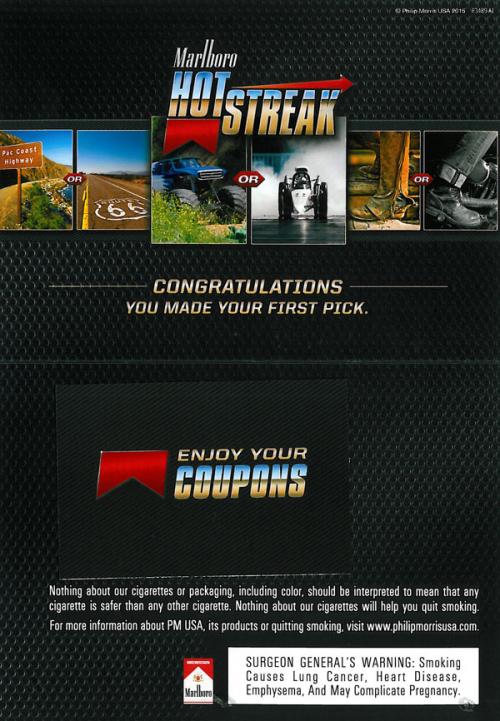 Direct mail received form Marlboro in March 2015 promoting the Hot Streak Sweepstakes. To play users vote daily between 2 pictures, if the vote with the majority they begin their streak. The direct mail features pictures of some of the matches and also includes 3 coupons. Text: "Congratulations you made your first pick." Direct mail received in DC.