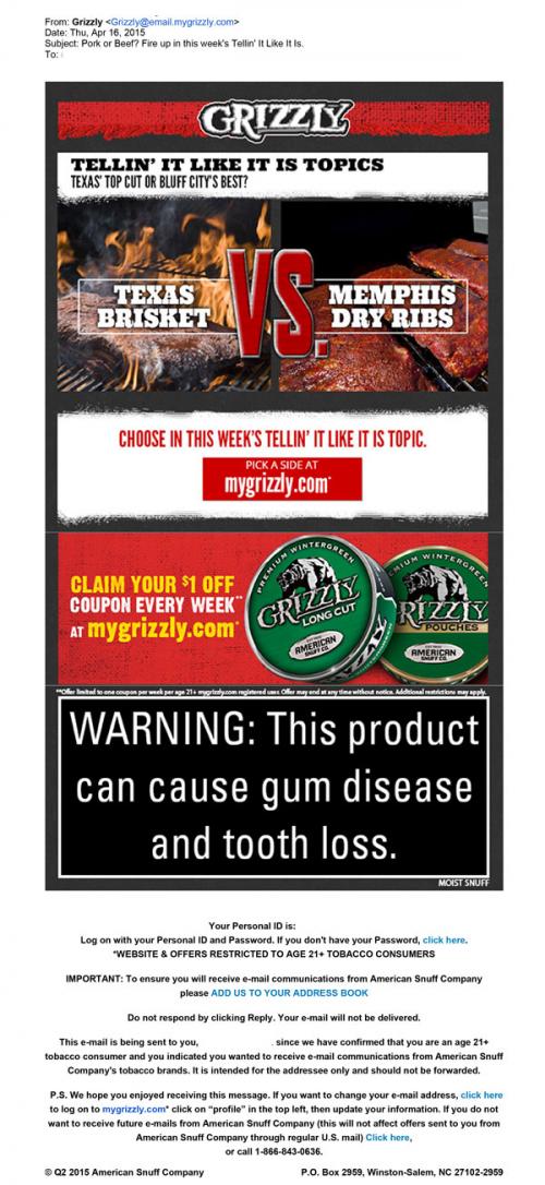 Grizzly email received in April 2015 inviting the recipient to the brand website to claim their weekly coupon and participate in this week's "Tellin' it like it is" topic discussion, pork or beef.