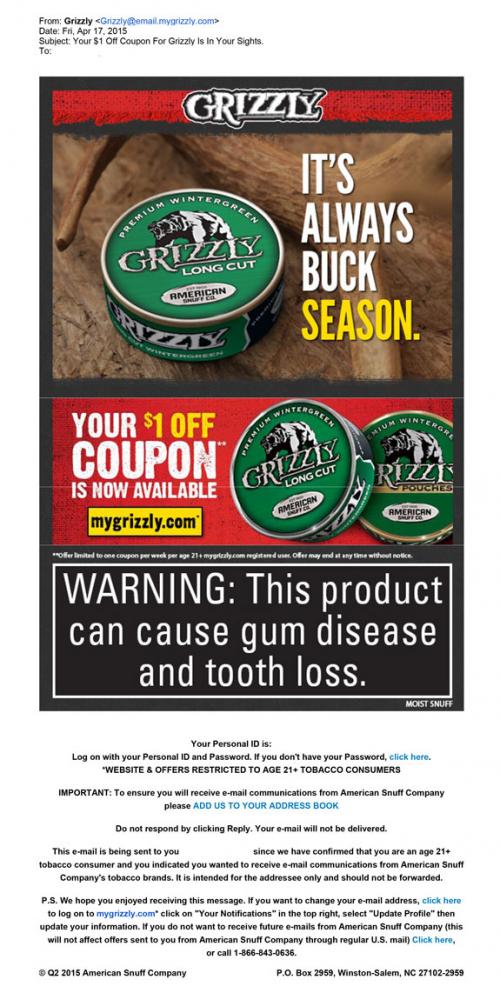 Email received form Grizzly in April 2015 offering recipient a coupon for sharing their thoughts on the brand website. Text: It's always buck season."