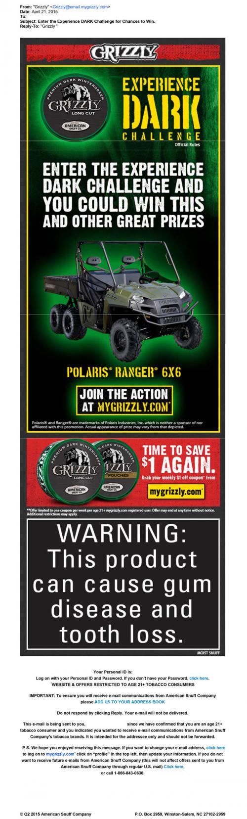 Email from Grizzly received on April 21, 2015 reminding recipient to enter the Grizzly Experience Dark Challenge. Email features an image a Polaris Ranger 6x6, one of the possible prizes and invites user to brand website to enter the sweeps. Text: "Enter the Experience Dark Challenge and you could win this and other great prizes." The email also reminds recipient to visit the brand website for their weekly coupon.