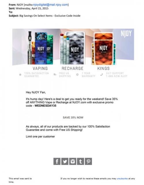 Email from NJOY received in April celebrating hump day with big savings on select items.Everything on the brand website is 35% off with the discount code provided in the email.