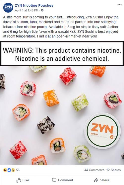 ZYN Facebook post with fake flavors invented for April Fool's.