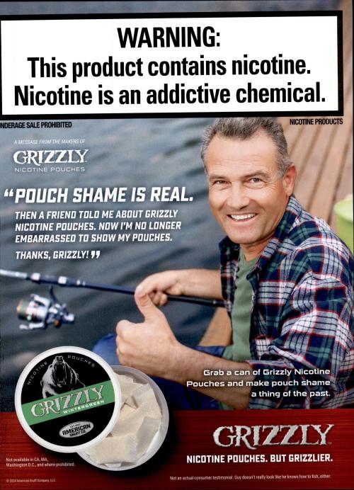 Magazine ad promoting Grizzly nicotine pouches, using their catchphrase "pouch shame" to suggest that their nicotine pouches are the more masculine choice. Text: "Grab a can of Grizzly nicotine pouches and make pouch shame a thing of the past."