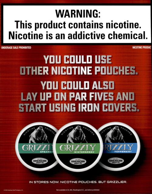 Magazine ad promoting Grizzly nicotine pouches, using golf lingo to imply that using other nicotine pouches would make you look foolish. Announces that the products are in stores now.