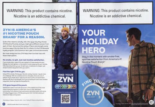 2 page magazine ad for ZYN, "Your Holiday Hero." One page describes the benefits of the product, highlighting the ZYN Rewards program. Images depict men in winter gear and ad copy directly address men. Includes a QR code to scan and visit the brand website.