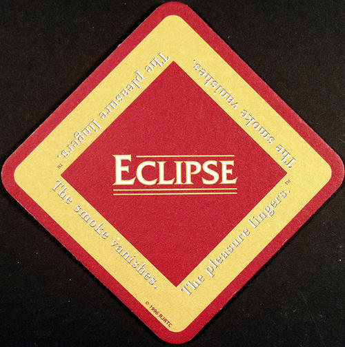 Eclipse paper coaster. "The pleasure lingers The smoke lingers" small, square, red and orange.