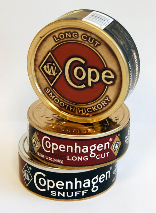 Image of three different styles of Copenhagen moist snuff: regular, long cut, and long cut hickory flavored.