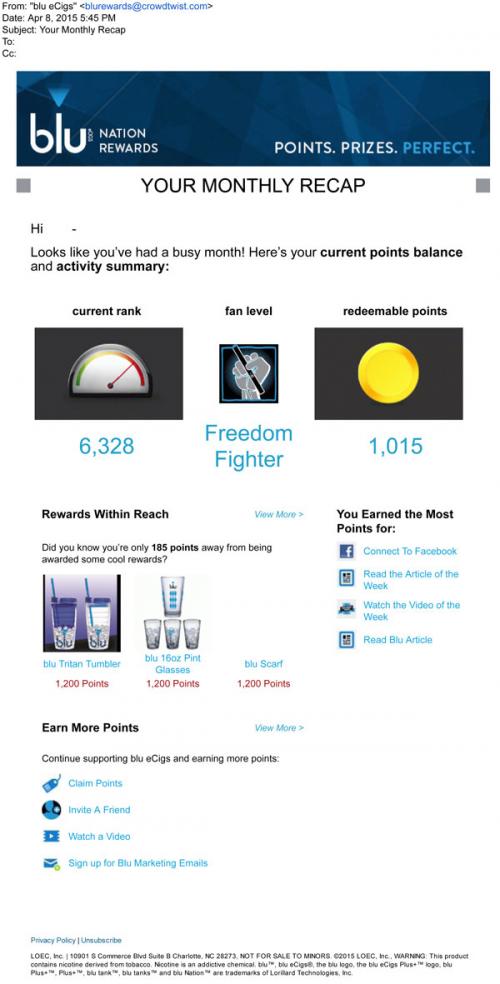 Monthly recap email in April 2015 from the blu Nation Rewards program. The member is currently at a "Freedom Fighter" fan level. Shows the redeemable points the member has, as well as possible rewards available, and links to earn more points on the brand website.