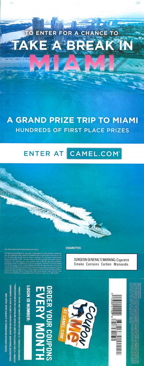 Direct mail received from Camel in May 2015 promoting the One Crush Away sweepstakes, where the grand prize is a trip to Miami. Direct mail invites recipient to the brand website where they can enter for their chance to win and also order their coupons every month.