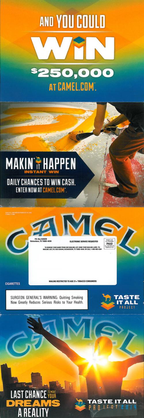 Direct mail from Camel in December 2014 promoting the Taste It All Project and chances to instantly win cash on the brand website. Includes an invite to participate in discussion on the related blog, as well as various coupons for Camel products. Text: "Last chance to make your dreams a reality"