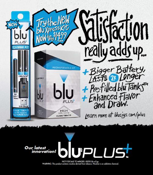 Magazine ad promoting the blu PLUS+ product and new Xpress Kit. Benefits listed include bigger battery, pre-filled tanks, and "enhanced flavor and draw." Also includes a suggestion to learn more at the brand website. Text: "Satisfaction really adds up..."