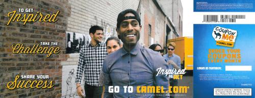 Direct mail from Camel received in Texas in February 2015. Direct mail piece contains coupons for cigarettes as well as Camel Snus. Text: "Uncover new experiences. To get inspired take the challenge share you success. Go to Camel.com"