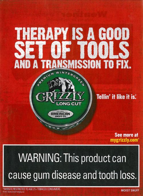 Magazine ad for Grizzly from the "Tellin' it like it is" series. Slightly different wording has an invitation to "See more at mygrizzly.com" Text: "Therapy is a good set of tools and a transmission to fix."