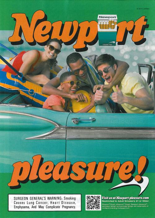 Magazine ad from Newport featuring four really excited people in a car near the beach. One man is giving two thumbs up. A box of cigarettes replaces the "o" in Newport. Includes a QR code so that viewers can access the brand website immediately with their mobile phones.