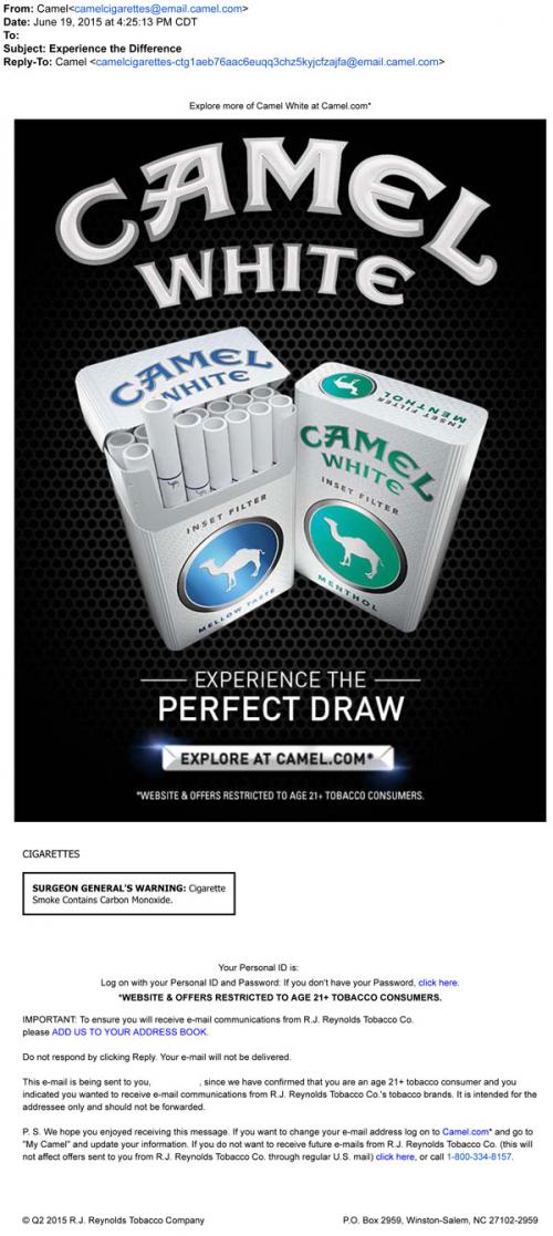 An email invitation from Camel in June 2015 to stop by the brand website and "experience the perfect draw" of their new product, Camel White. These cigarettes have a recessed filter and are currently only available in a few western states in the US.