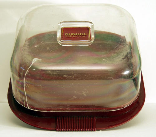 Red and clear plastic platter (for food) with gold print of: Dunhill London . Paris . New York .