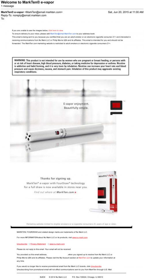 A welcome email from MarkTen in June 2015 thanking the recipient for signing up at the brand website, and informing them that their products are available in nearby stores. Links to the website to find retail locations. Compare to the email when MarkTen products were in limited markets: http://trinketsandtrash.org/detail.php?artifactid=9137&page=1