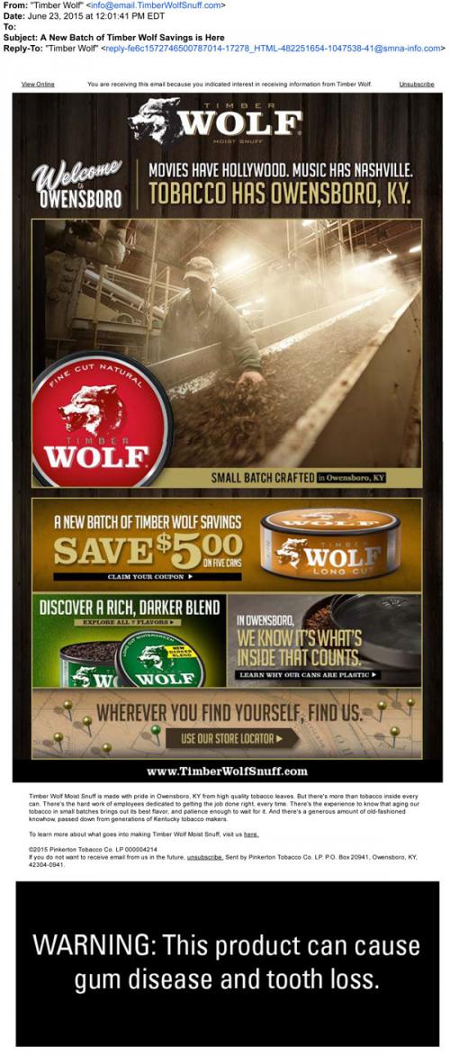 Email from Timber Wolf in June 2015 with several promotional links to their brand website, including a link to claim coupons. Visitors can explore their "darker" blend, find out why they use plastic cans, and find retail locations.