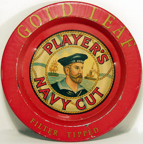 Red tin ash tray. Gold writing reads "Golf leaf filter tipped." Inside reads "Player's Navy Cut" with image of guy in navy uniform. His hat reads "Hero".