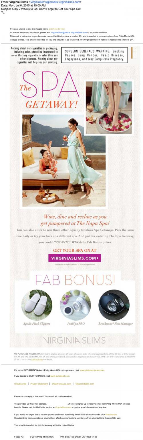 Email reminder from Virginia Slims in July 2015 to enter in the Spa Getaway sweepstakes on the brand website. Participants can also win spa-themed instant prizes just for entering.