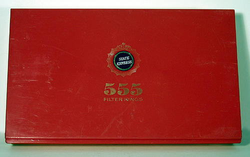 Orange and yellow plastic pack holder. "555 Filter Kings" is written in gold.