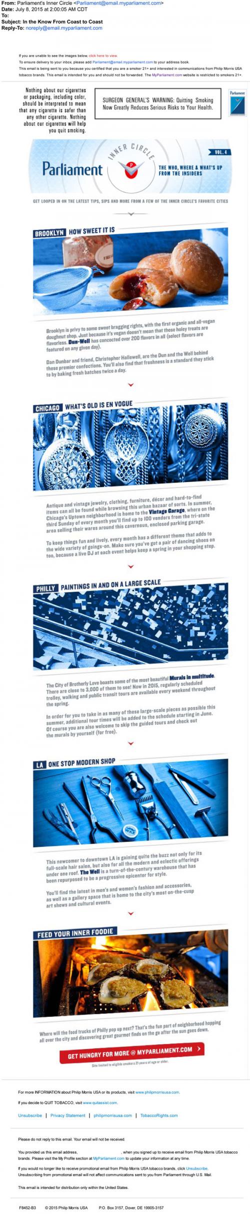 Email newsletter from Parliament in July 2015 featuring specialty stores and experiences to be found in several major cities across the US.