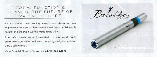 1/3 page ad promoting Breathe e-cigs, a brand that launched in late June at a party hosted by the magazine Maxim. The brand claims use of only natural and organic flavoring and a CEO that is an award-winning chef. Text: "Form, Function & Flavor: the future of vaping is here."