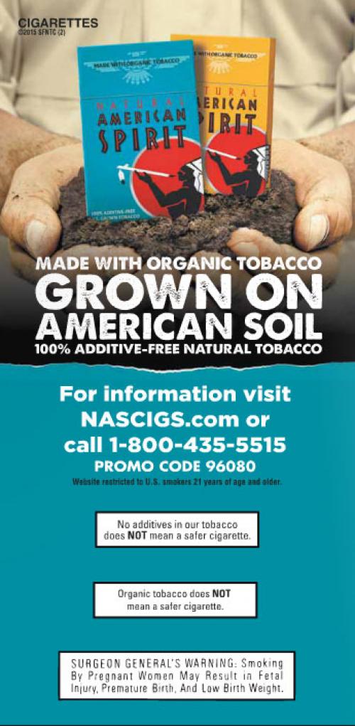 1/2 page American Spirit ad with hands holding dirt and cigarette packs.
