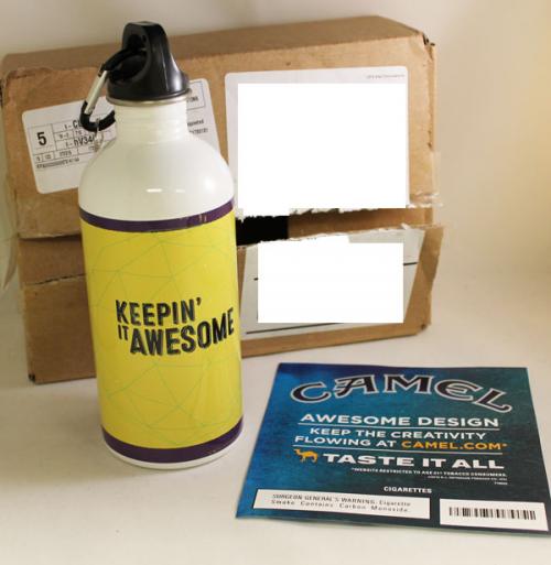 Direct mail from Camel received July 2015. Visitors to the brand website could design their own water bottle using clip art and phrases and have it shipped to their address for free. A two-sided card was included thanking the recipient for participating and telling them to "keep the creativity flowing" at the brand website.
