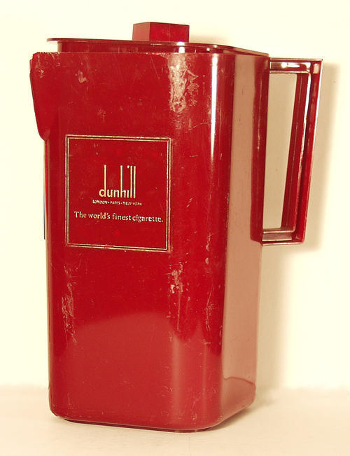 Red plastic pitcher with top. "Gold" Dunhill London . Paris . New York . "The World's Finest Cigarettes." in a square on 2 sides of the 4 sided pitcher.