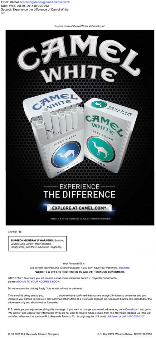 Email from Camel in July 2015 inviting the recipient to "Experience the Difference" with the new product Camel White, linking them to the brand website.
