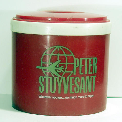 Red and white plastic ice bucket with Peter Stuyvesant logo and plane. In gold writing: "Wherever you go...so much more to enjoy."