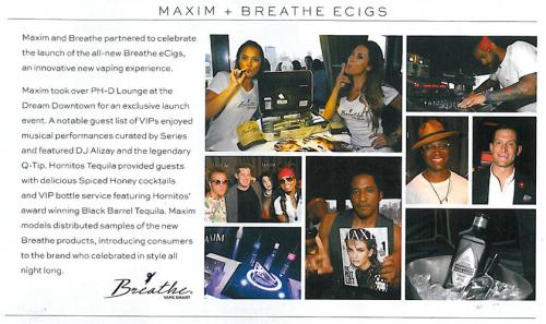 Breathe e-cig ad that mentions a recent product launch event featuring the musician Q-Tip and promoted by Maxim magazine.