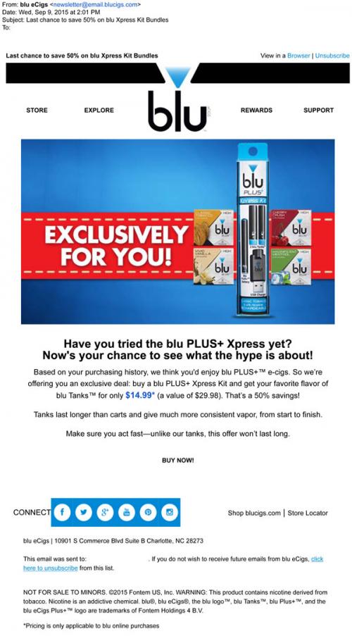 Blu email from September 2015 offering a discount on tank purchases with the purchase of a blu PLUS+ Xpress Kit on the brand website.